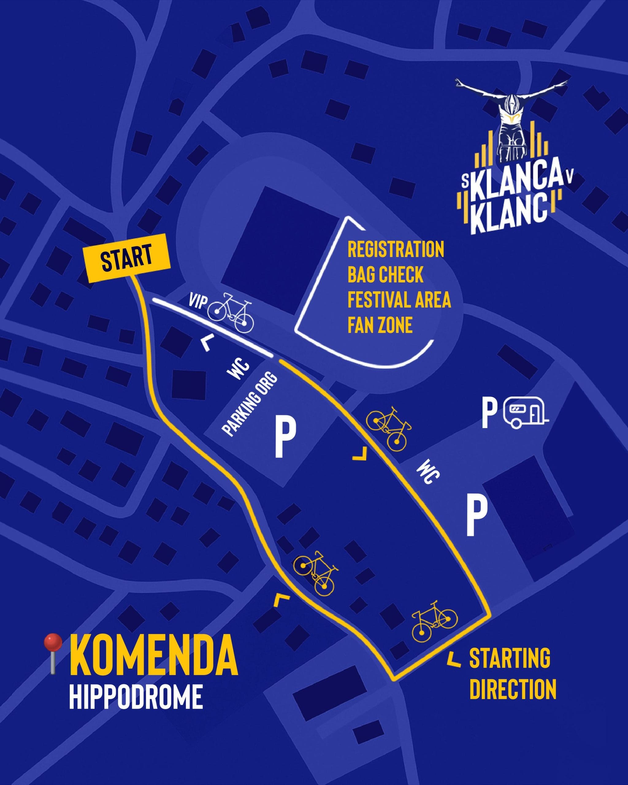 Dogodek S Klanca v klanc poteka na dveh ključnih lokacijah – Komenda, kjer se vse začne, in Krvavec, kjer se konča epski vzpon. Spodaj so vse pomembne informacije o startu, cilju in logistiki.